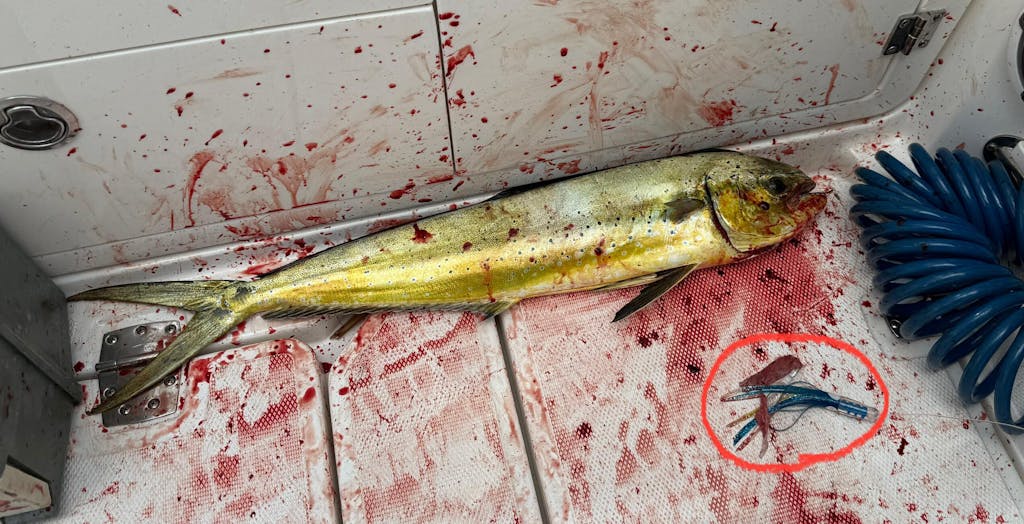 Next 2 trips we found tons of weeds and dolphin. 1st day got 3 in the boat not 1 hit a Schneider lure next trip out we got 5 in the boat and again not 1 on Schneider. I tried every one in the bag with and without a strip on them but nothing worked.