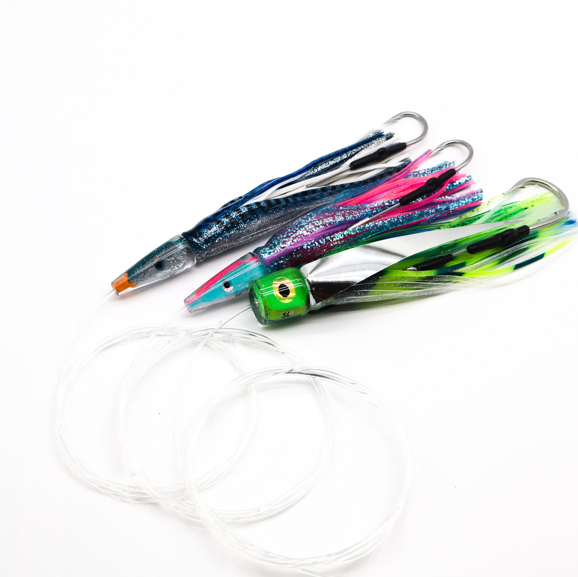 All of our rigs are built in-house using American-made materials. Every lure comes with a cable hook rig for strength and durability, paired with your choice of leader.