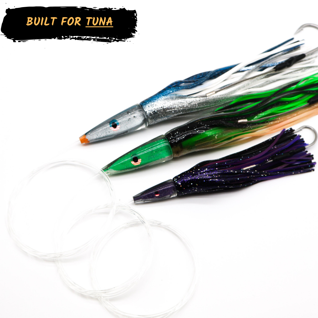 Includes two of our best 11" lures for targeting big yellowfin and bigeye tuna, paired with a 6" tuna bullet for finicky fish that want a bite-sized target.