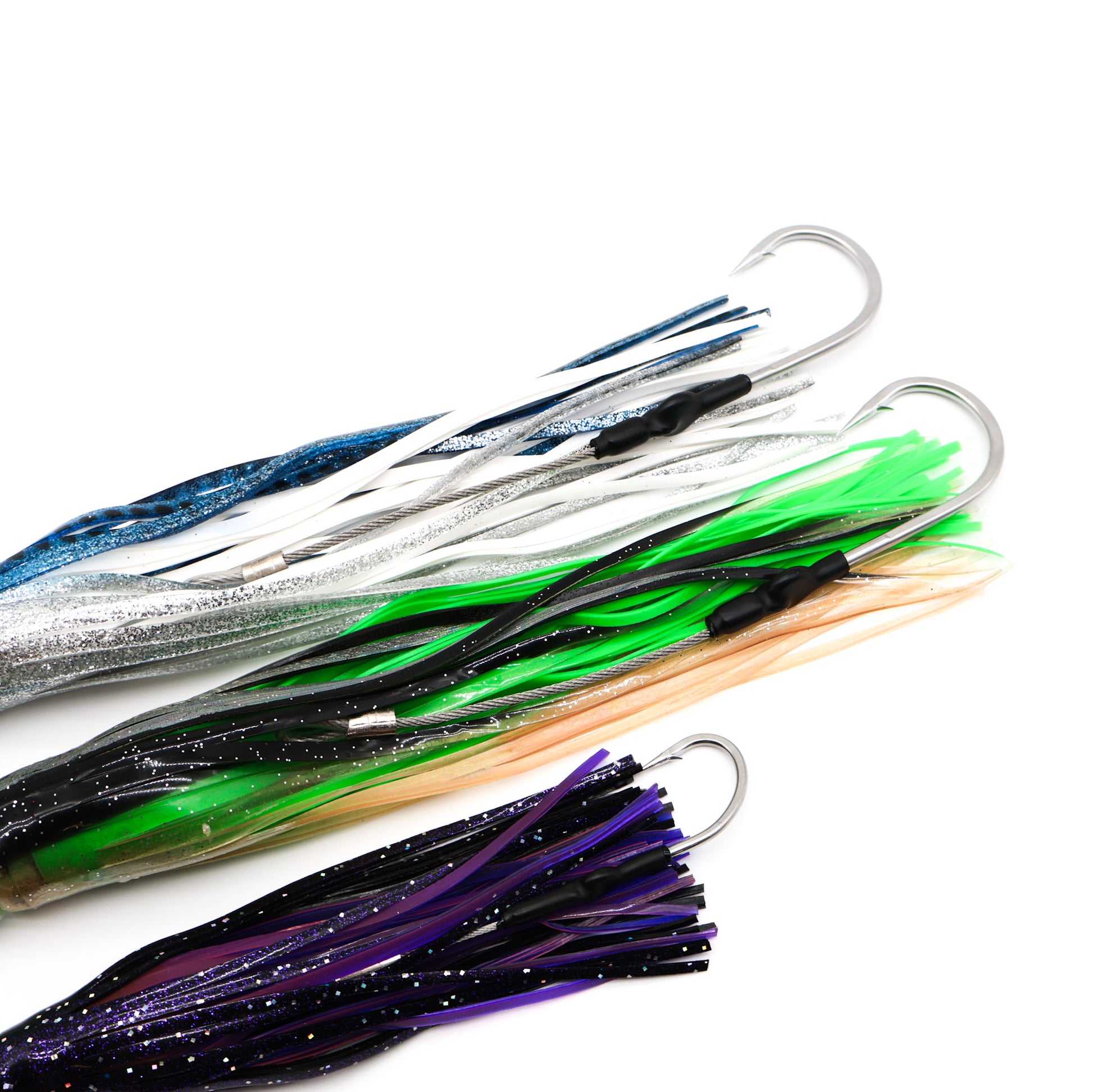All of our rigs are built in-house using American-made materials. Every lure comes with a cable hook rig for strength and durability, paired with your choice of leader.
