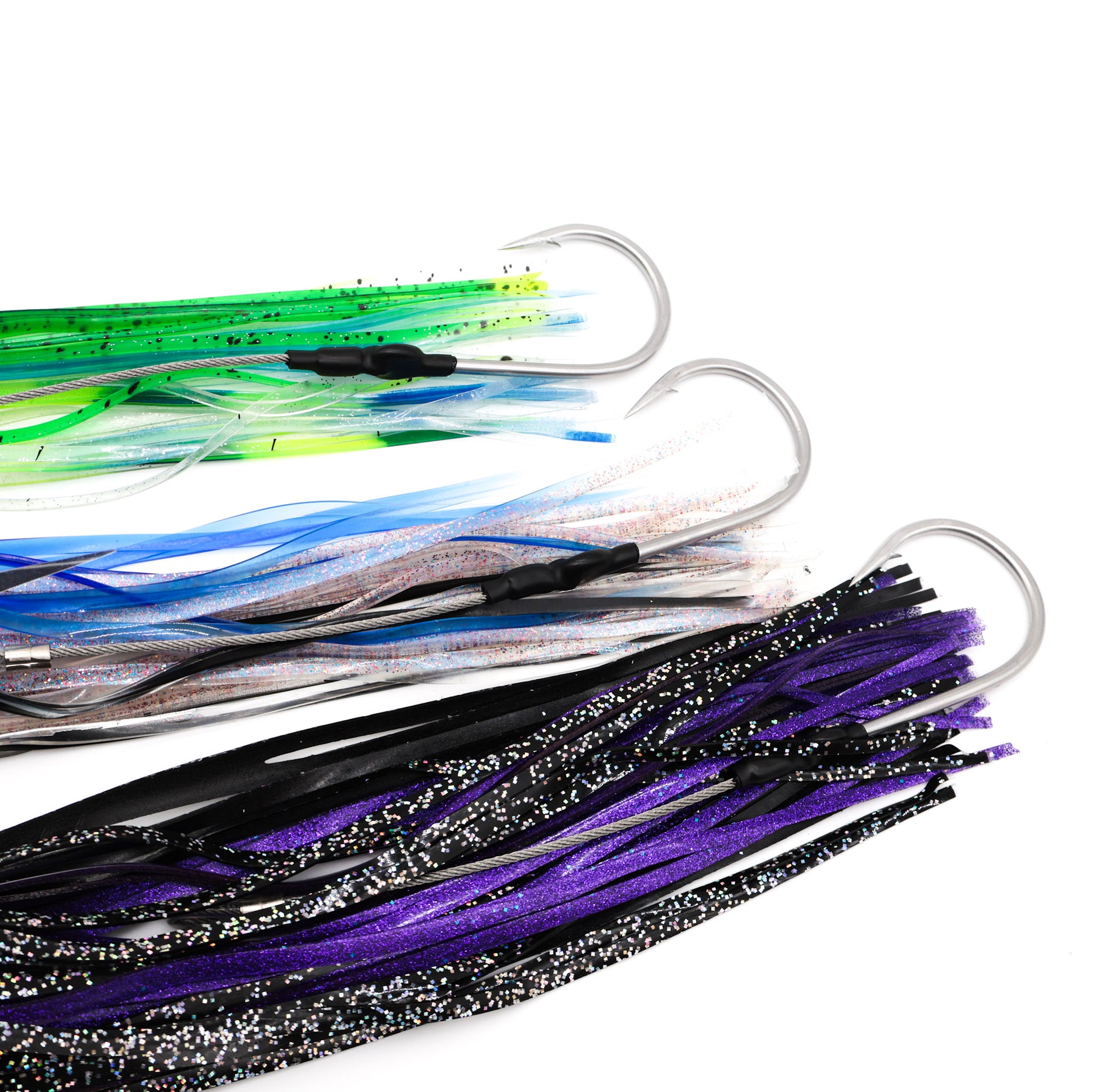 All of our rigs are built in-house using American-made materials. Every lure comes with a cable hook rig for strength and durability, paired with your choice of leader.